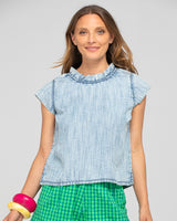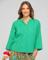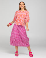 The Moonlight fabric is a midnight navy cotton with a pinstripe of rose and a glittering metallic bronze thread available in Boom Shankar’s star winter essentials of Lux jacket, pants, skirt and shirt. The Moonlight Lux shirt and skirt worn together are a match made in heaven. Moonlight matched back with the Boysenberry garments in the Somewhere Over The Rainbow story is a total colour crush.