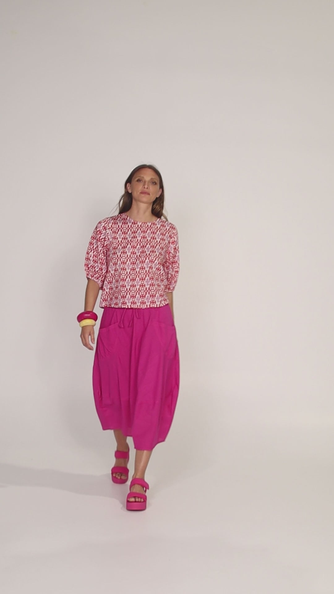 100% cotton, slightly cropped length, elasticated elbow-length puff sleeves, button fastening at the back and a round neckline.