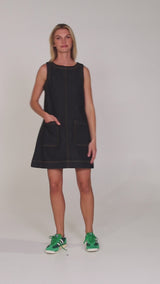 The Boom Shankar Bellerose Tunic is a sleeveless above-the-knee denim mini dress in Midnight Denim, with two front patch pockets and lovely contrast golden stitching. Wear it with sneakers for an easy, street-ready look, and layer a cardigan over the top as the temperature drops.