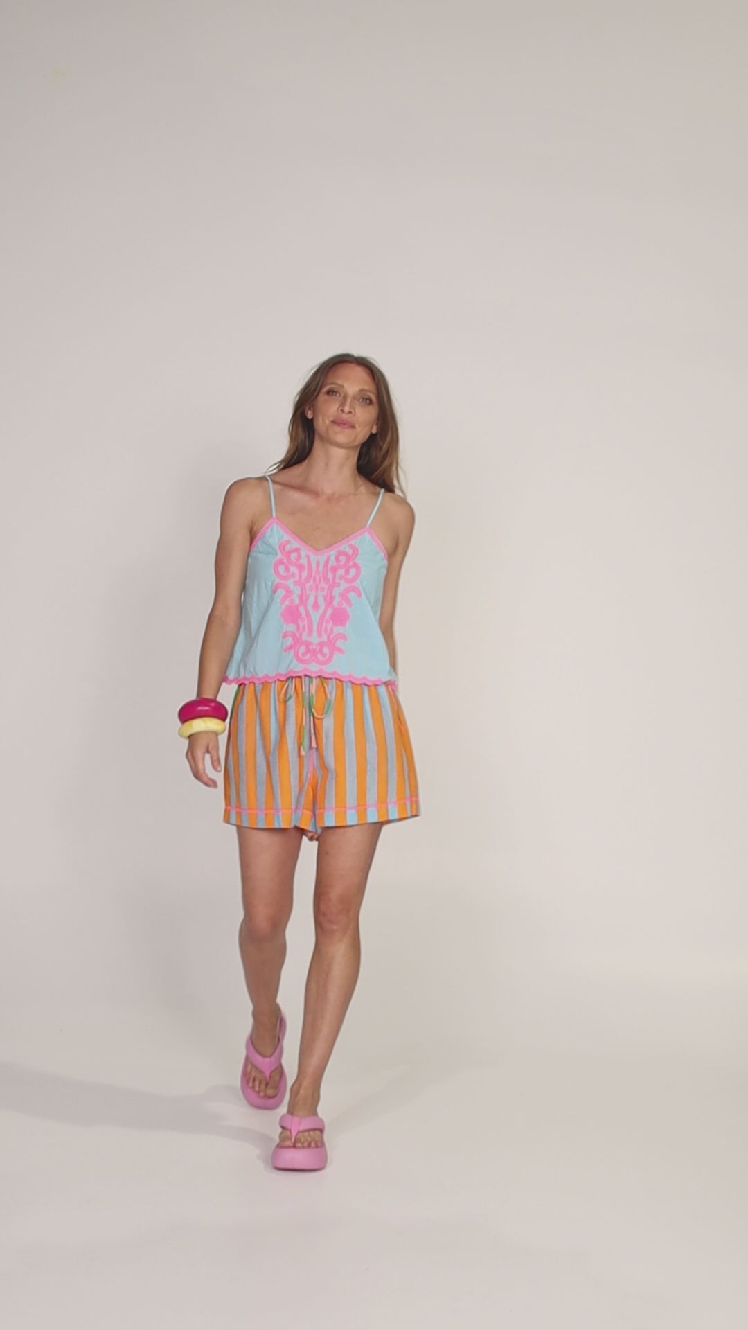100% cotton, mid-thigh length, contrast neon stitch detail, elasticated waistband with tie cords, contrast stripe on pockets and tie cords and front pockets.
