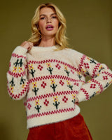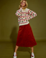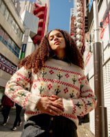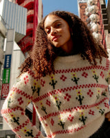 The Flower Jumper brings a nostalgic, handcrafted warmth to the season. A soft cream base is scattered with an enlarged cross-stitch motif of flowers in cherry red, forest green and yellow.