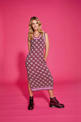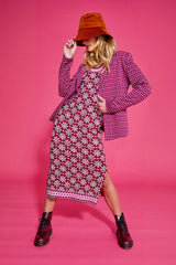Merlot Knit brings a deep, wine-toned warmth to your wardrobe, grounded in a rich burgundy base and elevated with a soft, graphic floral motif. Accents of blush and cream add contrast and femininity, creating a look that feels bold yet wearable, striking the perfect balance between statement and staple. Crafted from a viscose and polyester blend, this knit offers a smooth, soft hand feel with comfortable stretch that moves effortlessly with the body. Designed for ease and versatility, it delivers both structure and softness across every silhouette. Pair it back with Himari Check for a playful clash of print, or style with our Cherry Bellissimo Tank and Cranberry Dharma corduroy pant for a layered, tonal look that feels rich, modern and considered.
