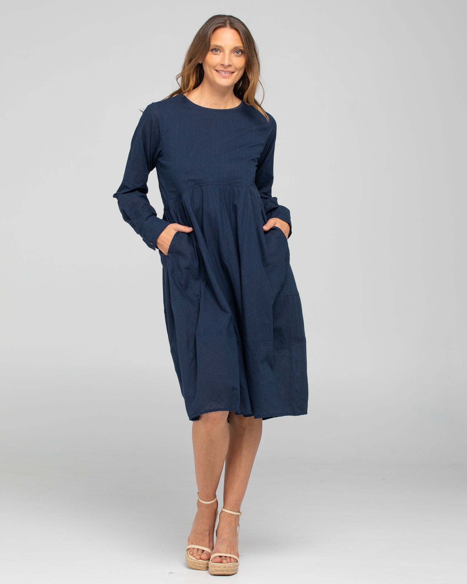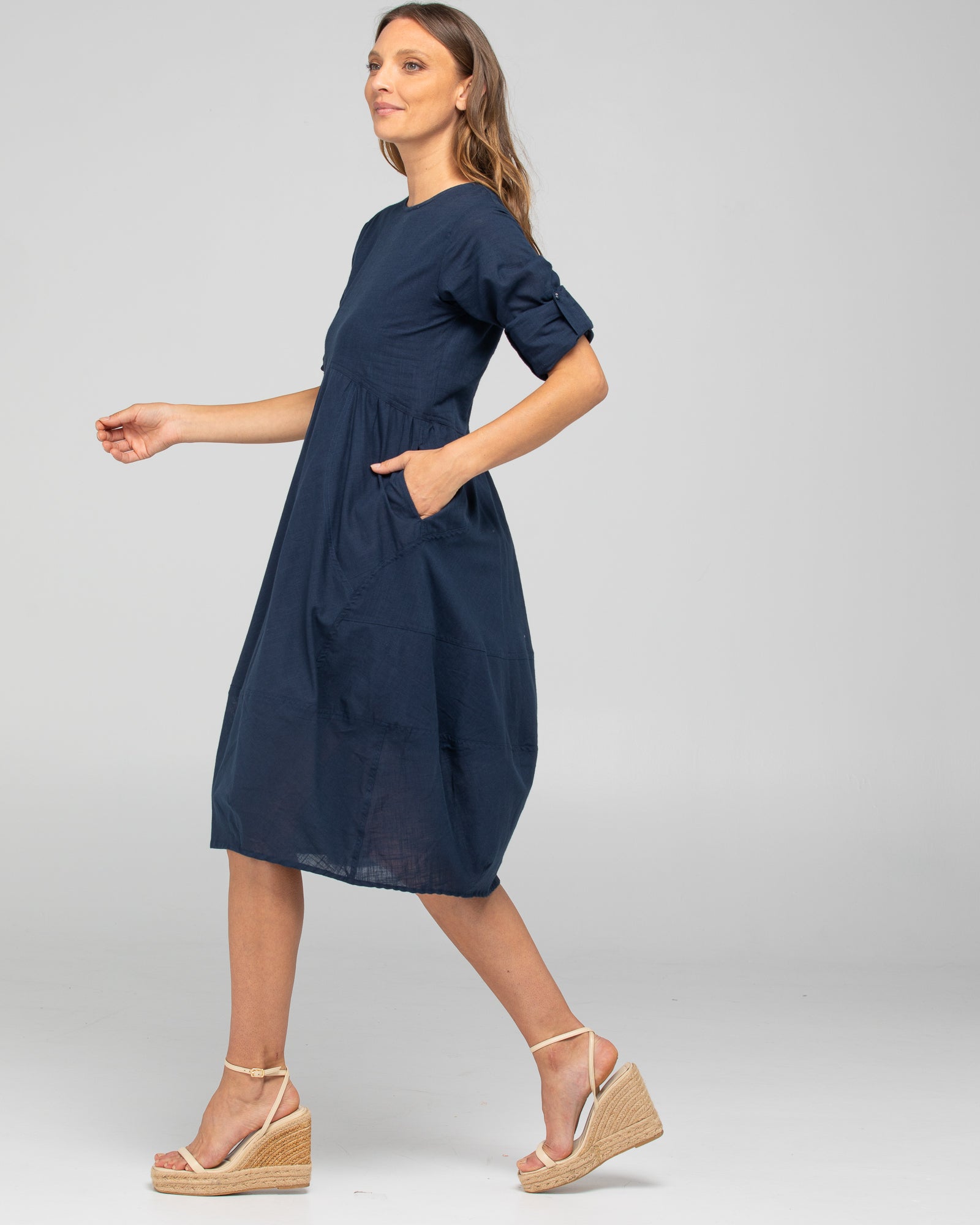 100% cotton, below knee length, high scooped neckline, curved seam detail with gathers falling from under bust, long sleeve with two buttons on cuff and button tab on upper arm to wear rolled up or down, two side pockets, seam and panel detail for signature Guru look, slip on, fully lined body, unlined sleeve.