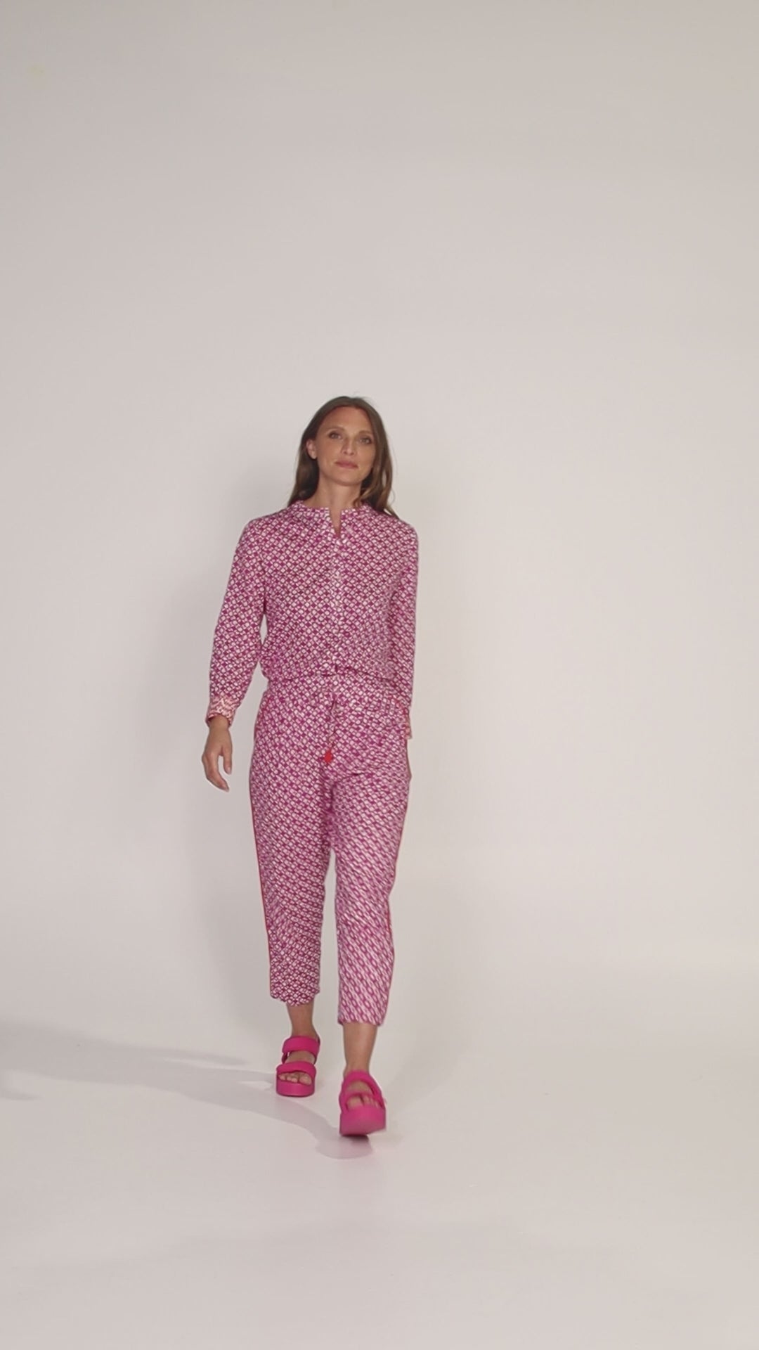 100% cotton, high waisted slim pants, cropped length, elasticated back, tie front waistband, 2 side pockets.