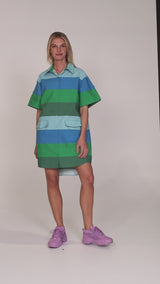 COLOUR IN MOTION. Emi Blue brings confident, modern energy to your wardrobe with her striking bands of oceanic blues and rich emerald greens. Inspired by shifting horizons and city skylines, this bold stripe is fresh, directional and effortlessly cool. Crafted from crisp cotton poplin, Emi Blue is designed for all-day wear with a compact and lustrous finish that moves beautifully with you. Wear these graphic silhouettes together for a head-to-toe moment, or break them up and style back with denim, crisp white, or vibrant brights for a colour-blocked look that turns heads.