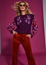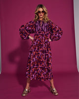 Kazu brings a deep, expressive energy to the season. A rich plum base is swept with abstract pampas grass motifs in lilac and burnt orange. It’s fluid, striking and full of bohemian warmth.