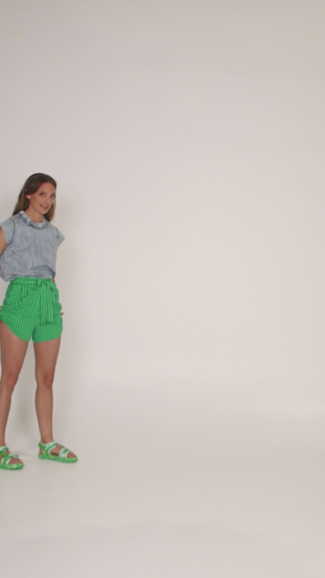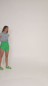 100% Lyocell, ruffled/gathered high neckline (elasticated), slightly cropped length, short flowy raglan sleeves and side splits.