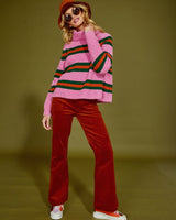 The Shanti Jumper is cosy and completely unsubtle, exactly as it should be. Broad stripes of bubblegum pink, forest green and burnt orange come together in a colour combination that feels retro yet fresh, confident and full of personality.