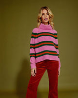 The Boom Shankar Shanti Jumper is a chunky, relaxed-fit turtleneck featuring broad stripes of pink, forest green and burnt orange. Knitted in a chunky cable with a generous turtleneck and relaxed, oversized silhouette, the Shanti is your go-to when the temperature drops. Cosy enough for the coldest days, wear it with rust cord or style with dark denim.