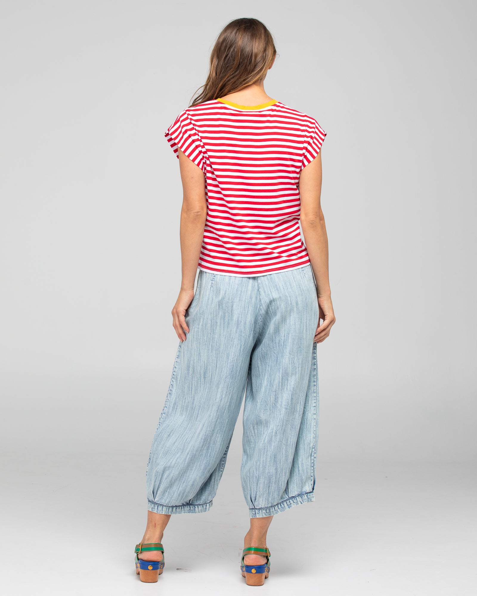 100% lyocell, 3/4 length wide leg pant with an invisible side zipper, two back elasticated waistband panels for comfort and front pockets.